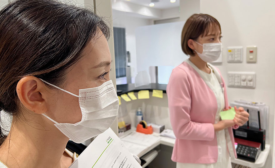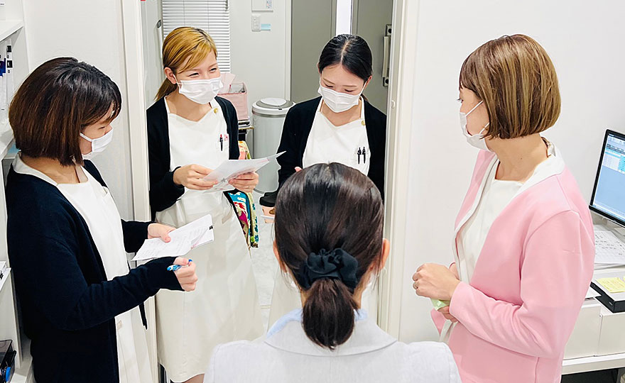 ピンクの白衣の方は歯科衛生士さんですね。みんなメモを取りながら臨みます。